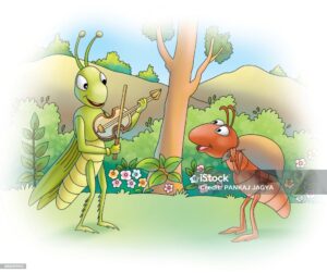 Pada suatu hari yang cerah di akhir musim gugur, sekeluarga semut sedang sibuk di bawah hangatnya sinar matahari, mengeringkan biji-bijian yang mereka simpan selama musim panas. Sementara, seekor belalang yang kelaparan, dengan biola di bawah lengannya, datang dan dengan rendah hati meminta sedikit makanan. “Apa!” teriak para semut terkejut, “Apakah…