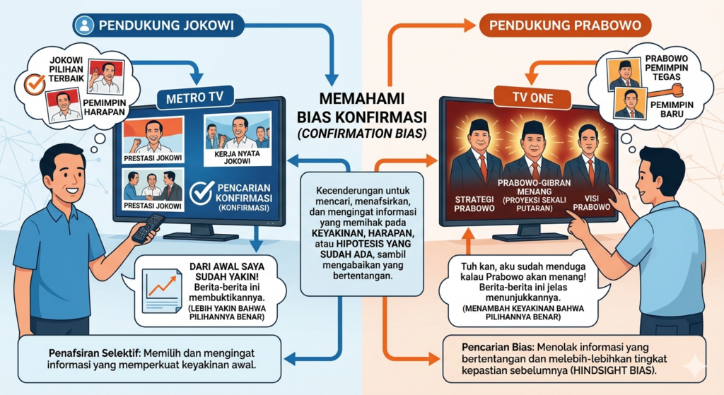 - Kita cenderung memilih menonton dan membaca berita di media elektronik, cetak maupun online yang sejalan dengan keyakinan dan pandangan kita selama ini. Pada pemilu 2014 misalnya, pendukung Jokowi lebih suka menonton Metro TV sedangkan pendukung Prabowo lebih suka menonton TV One. Saat itu pemilik stasiun Metro TV mendukung Jokowi sehingga berita yang disiarkan adalah berita positif tentang Jokowi dan berita negatif tentang Prabowo. Sebaliknya, saat itu pemilik TV One adalah pendukung Prabowo sehingga berita yang ditampilkan lebih banyak berita positif mengenai Prabowo dan berita negatif mengenai Jokowi. Bagi pemirsa pendukung Jokowi, berita di Metro TV mengkonfirmasi pandangan positif mengenai Jokowi dan menambah yakin bahwa pilihannya benar. Bagi pemirsa pendukung Prabowo, berita di TV One mengkonfirmasi pandangan positif mengenai Prabowo dan menambah keyakinan bahwa pilihannya benar.