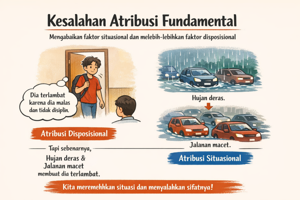 Jadi bagaimana dengan fundamental attribution error? Ini merupakan kesalahan dalam melakukan proses atribusi di mana kita cenderung menambatkan penyebab perilaku lebih pada faktor disposisional, bahkan jika ada faktor situasional yang sangat jelas mempengaruhi.