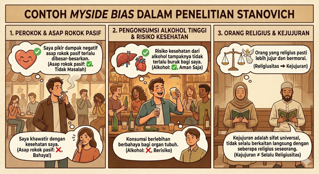Dalam penelitiannya, Stanovich menemukan bahwa myside bias umum terjadi saat orang mengemukakan pandangannya mengenai sesuatu. Perokok cenderung kurang mengakui dampak negatif asap rokok pasif terhadap kesehatan. Orang yang mengonsumsi alkohol dalam jumlah relatif lebih tinggi cenderung kurang mengakui risiko kesehatan akibat konsumsi alkohol. Orang yang lebih religius cenderung berpikir bahwa religiusitas mengarah pada kejujuran. Saat responden warga Amerika Serikat ditanya pendapatnya mengenai invasi Amerika Serikat terhadap Irak pada tahun 2003 di bawah kepemimpinan George W. Bush, mereka yang memilih George W. Bush cenderung berpikir bahwa invasi ke Irak membuat kita lebih aman dari teroris dibandingkan dengan mereka yang memilih John Kerry, rival Bush dalam pemilu.