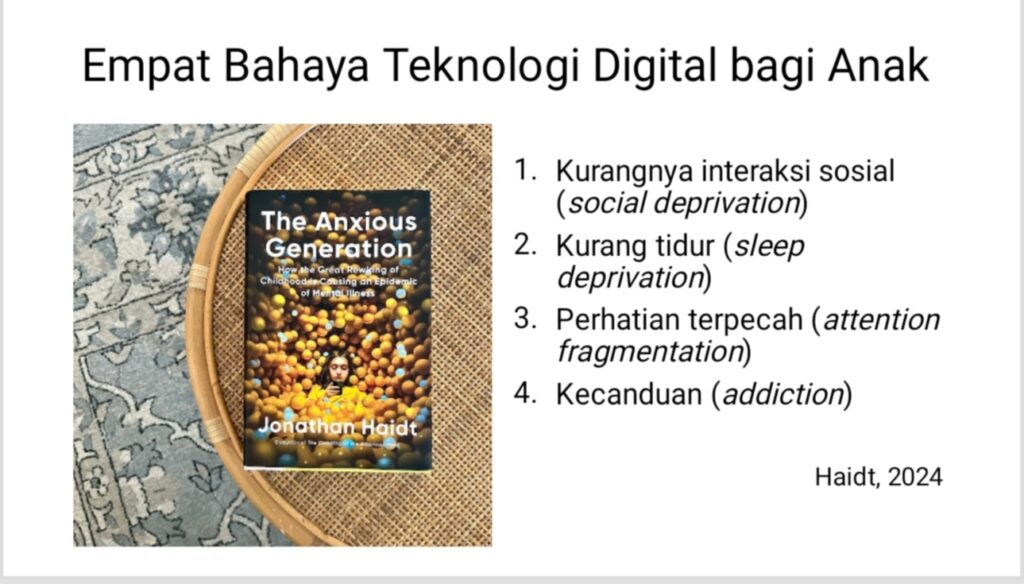 Ilmuwan psikologi sosial Jonathan Haidt, dalam bukunya Anxious Generation, menyebutkan empat bahaya penggunaan gadget pada anak dan remaja yang patut diperhatikan orangtua. Empat bahaya tersebut adalah sebagai berikut: