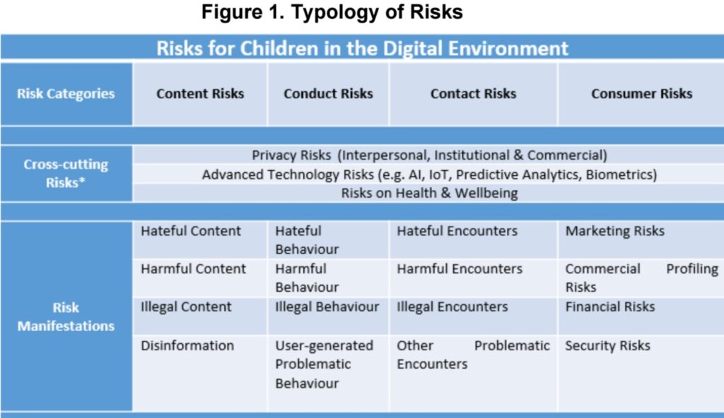 Pada tahun 2021 the Organisation for Economic Cooperation and Development (OECD) menerbitkan dokumen berjudul Children in the Digital Environment: Revised Typology of Risks. Ada lima tipologi risiko penggunaan gadget pada anak-anak. Penyusunan tipologi ini dibuat berdasarkan data pendukung termasuk bukti-bukti ilmiah. Berikut ini dijelaskan risiko-risiko dimaksud dengan merujuk pada dokumen tersebut.