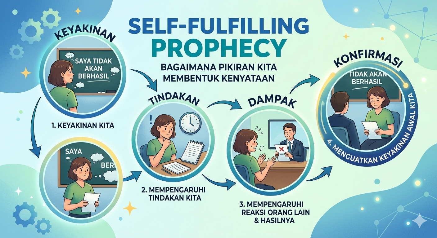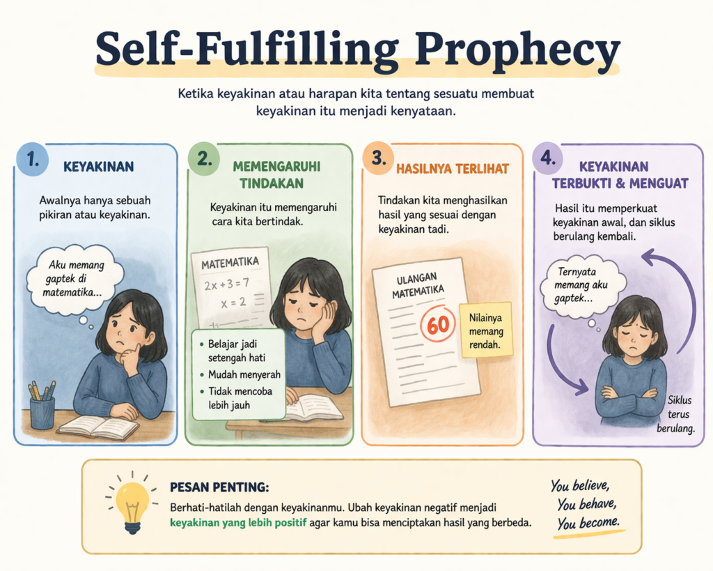 Suatu kepercayaan atau harapan yang membantu mewujudkan dirinya sendiri, misalnya, ketika seseorang mengharapkan rasa gugup akan mengganggu kinerjanya dalam wawancara kerja atau ketika prasangka seorang guru tentang kemampuan seorang siswa memengaruhi prestasi anak tersebut entah jadi lebih baik atau lebih buruk.