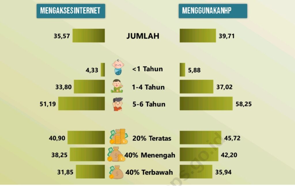Ya, anak-anak di Indonesia telah terpapar handphone, dan juga internet, bahkan sejak usia dini. Data dari Badan Pusat Statistik (BPS) 2024 menunjukkan bahwa anak usia dini di Indonesia sudah banyak yang mengakses internet dan menggunakan handphone, bahkan sebelum usia satu tahun. Semakin bertambah usia (sampai 6 tahun) semakin meningkat persentase anak usia dini di Indonesia yang mengakses internet dan menggunakan handphone. Dari 10 anak Indonesia berusia 6 tahun, 5 diantaranya telah mengakses internet dan menggunakan handphone. Data yang sama juga menunjukkan semakin tinggi pendapatan orangtua berhubungan dengan semakin tingginya anak terpapar internet dan handphone.